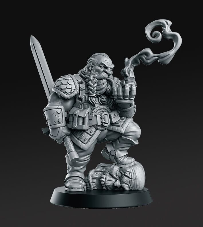A dwarf monster hunter with longword and pipe, standing on the head of his last bounty.