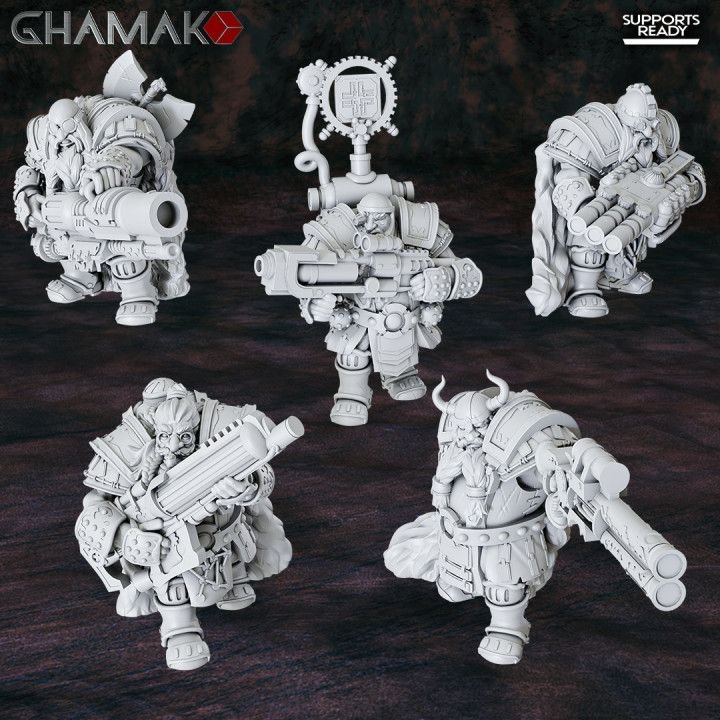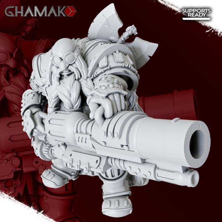 Shrewd and mighty dwarves, lords of steam. Their devastating weapons leave long trails of corpses that mark their inexorable pace. The perfect addition to your dwarf army. Includes 5 32mm circle bases. These beautiful miniatures are made of high-quality resin and printed in 4k resolution! Some assembly required.