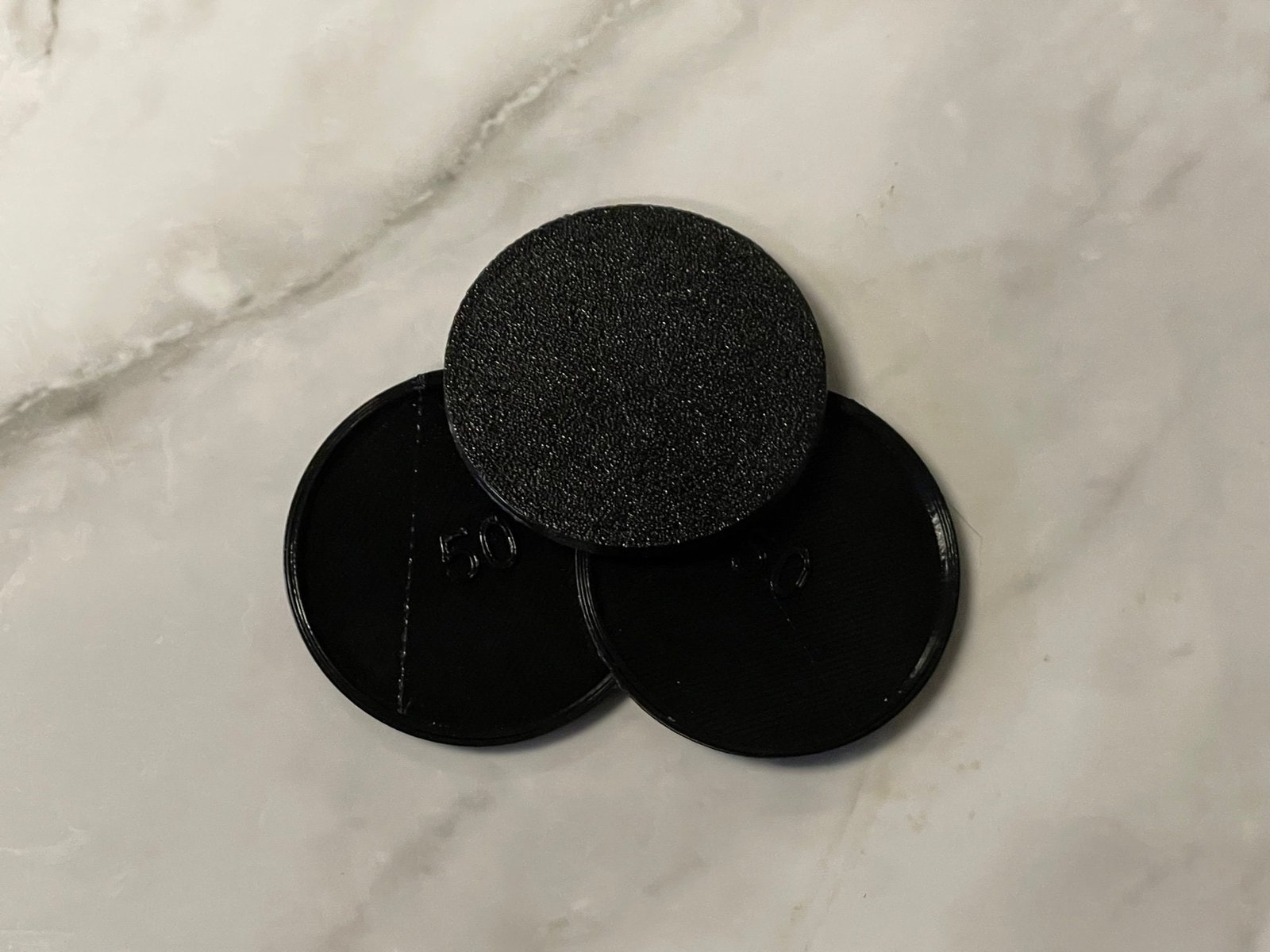 This listing is for custom printed bases for your miniatures, it includes 3 50×50 circular plastic bases in black. We designed these bases to be hollow bottomed and included their size printed on the bottom to make them easier to identify and use!