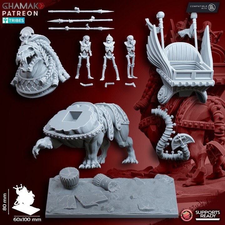 The perfect addition to your army. This kit includes an Undead Sphinx being ridden by 3 skeletons and a 100x60mm square base. These beautiful miniatures are made of high-quality resin and printed in 4k resolution! Some assembly required.
